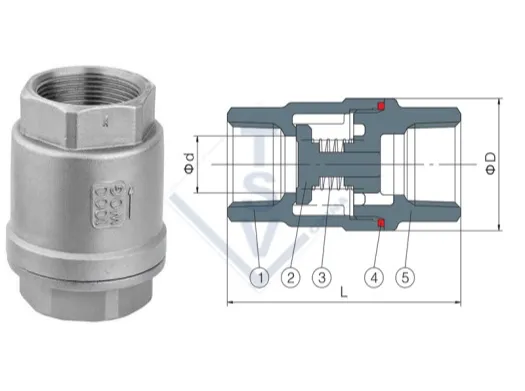 A 2Pcs Vertical Thread Check Valve is a type of check valve designed for vertical installation in a piping system, allowing fluid flow in one direction while preventing reverse flow (backflow). It is called a "2-piece" valve because it consists of two main components: the body and the bonnet, which are threaded together for easy assembly and maintenance. The valve features threaded connections, making it suitable for small to medium-sized piping systems where welding or flanges are not required.
